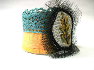 Bratara textila , din panza si dantela, vopsite manual, pe suport din fetru, se inchide cu doua capse metalice. Partea din fata reprezinta o frunza de toamna, si este cusuta pe etamina , pusa in evidenta de o rozenta de tulle negru.